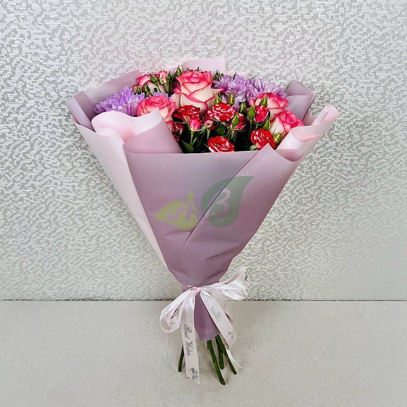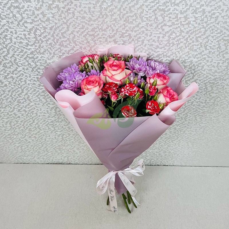 Состав и характеристики букета из кусовых роз и хризантем "Тёплые объятия":